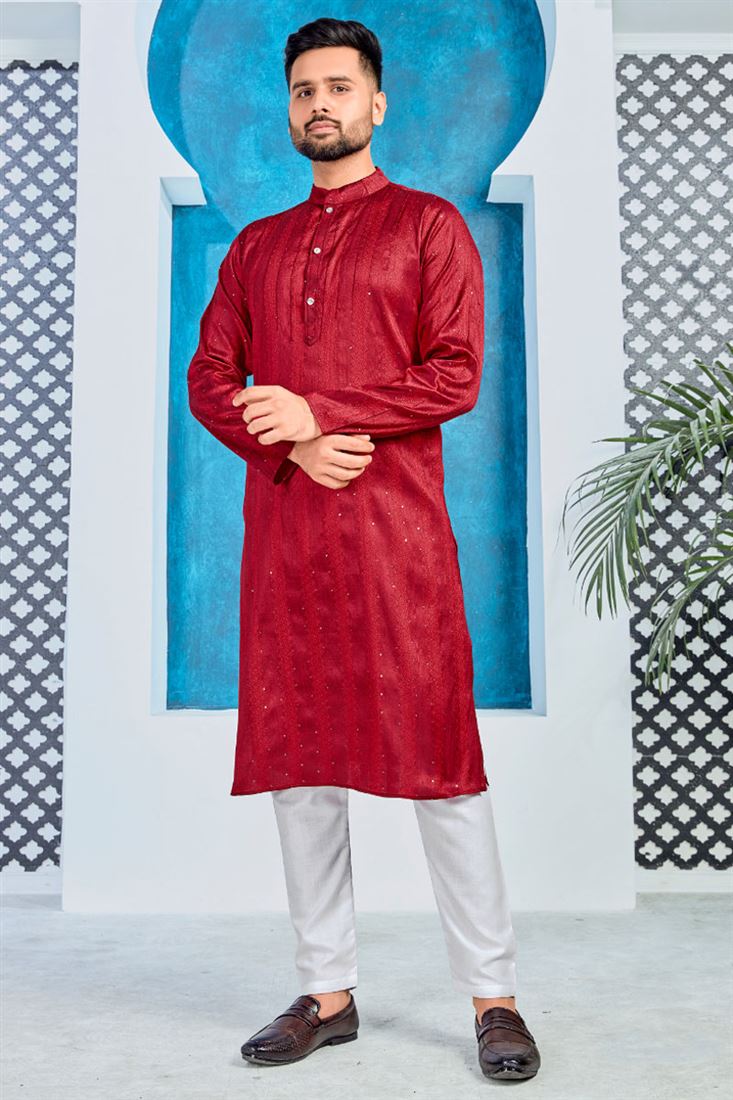 Traditional Festival Fancy Work Kurta Pyjama Set In Jacquard Fabric Red Color