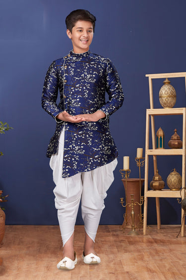 Traditional Wear Jacquard Silk Fabric Readymade Indo Western For Boys In Navy Blue Color