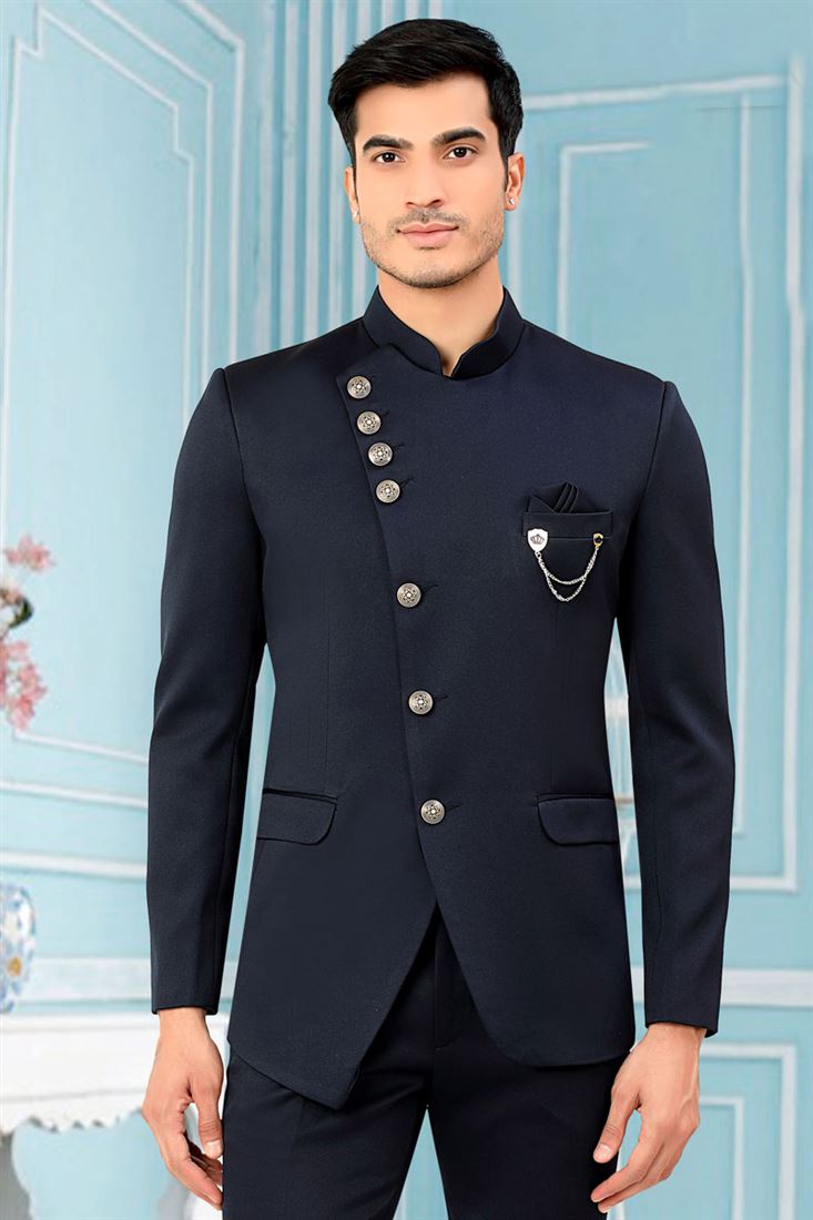 Trendy Textured Navy Blue Color Rayon Fabric Wedding Style Jodhpuri Jacket