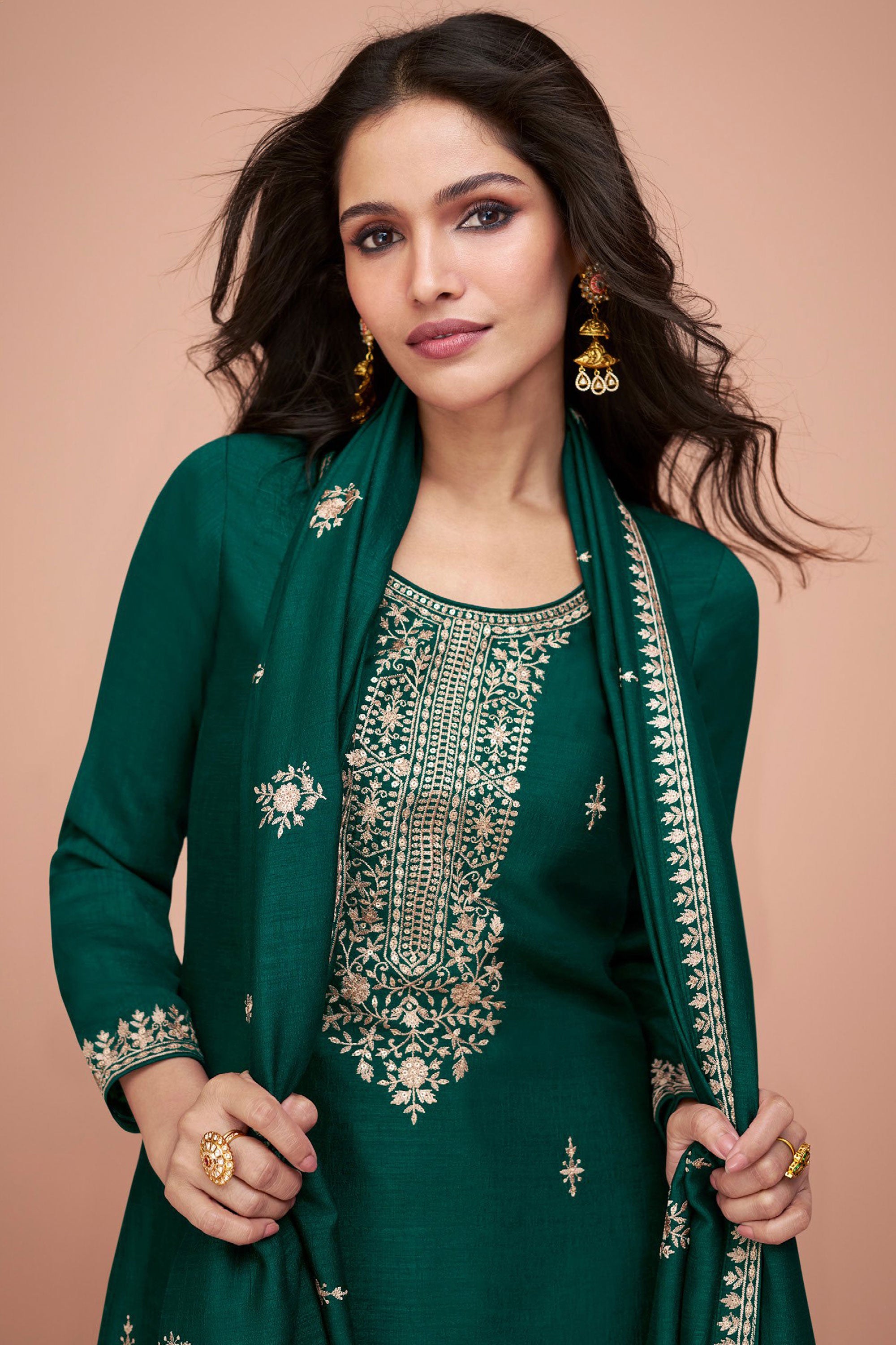 Vartika Singh Dark Green Color Embroidered Work On Art Silk Fabric Beatific Palazzo Suits