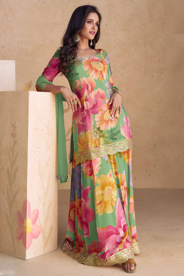 Vartika Singh Incredible Chinon Fabric Sea Green Color Readymade Palazzo Suit