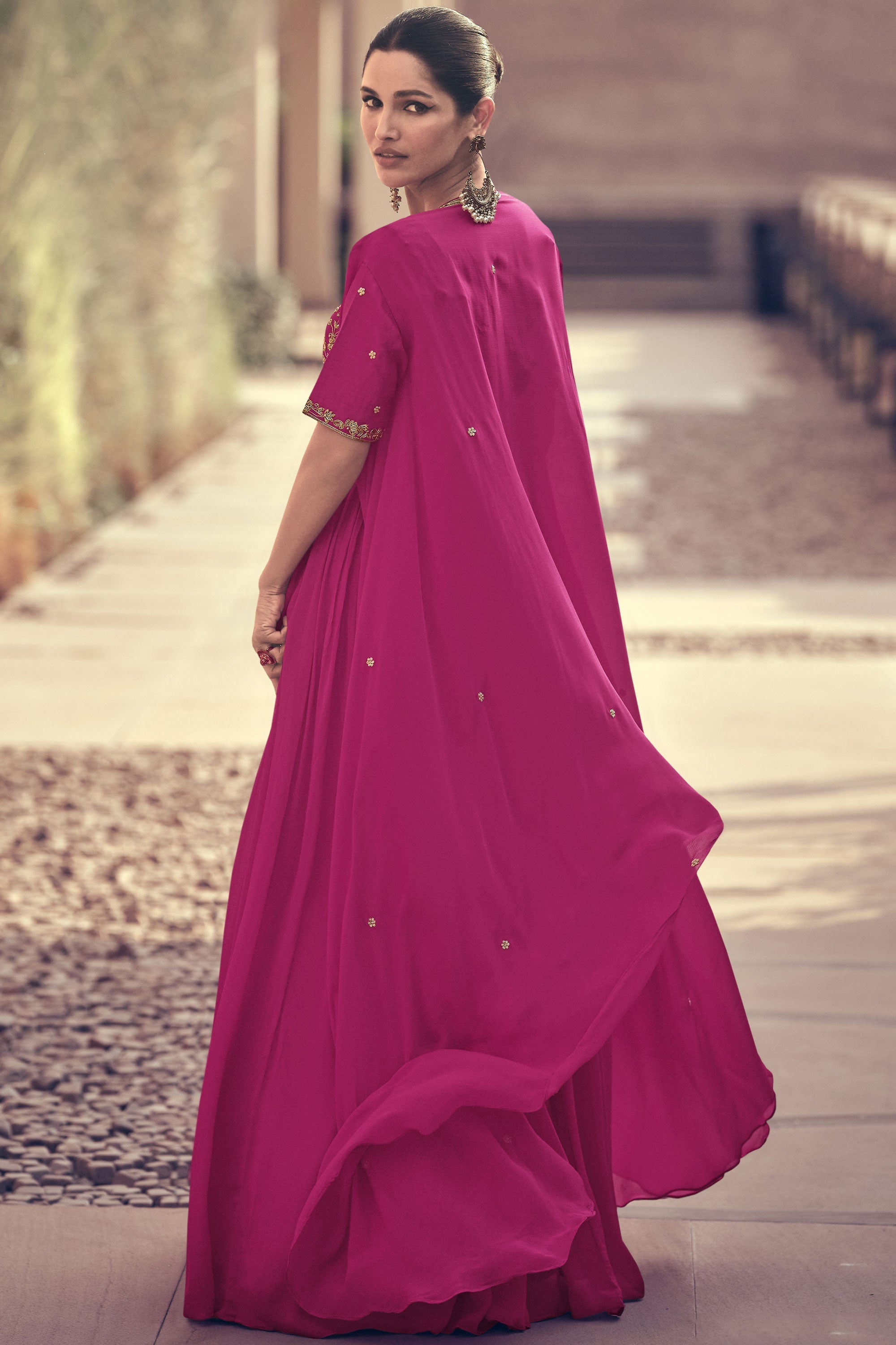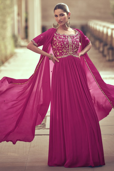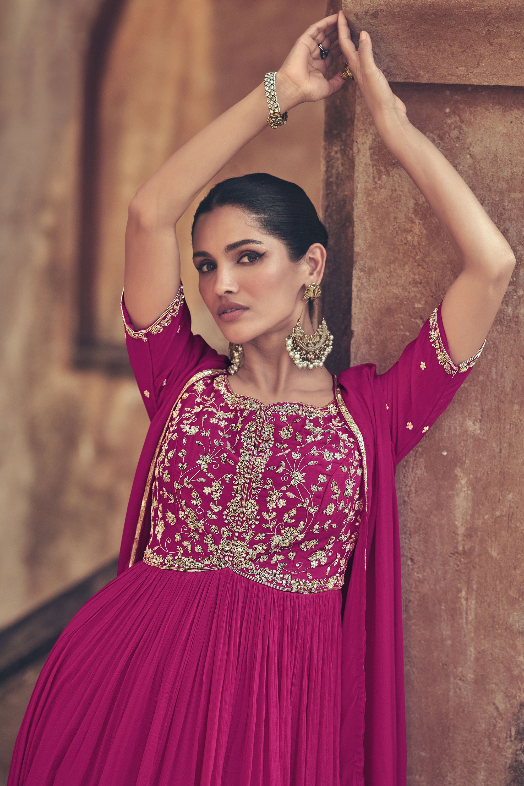 Vartika Singh Rani Color Fashionable Readymade Gown With Shrug In Chinon Silk Fabric