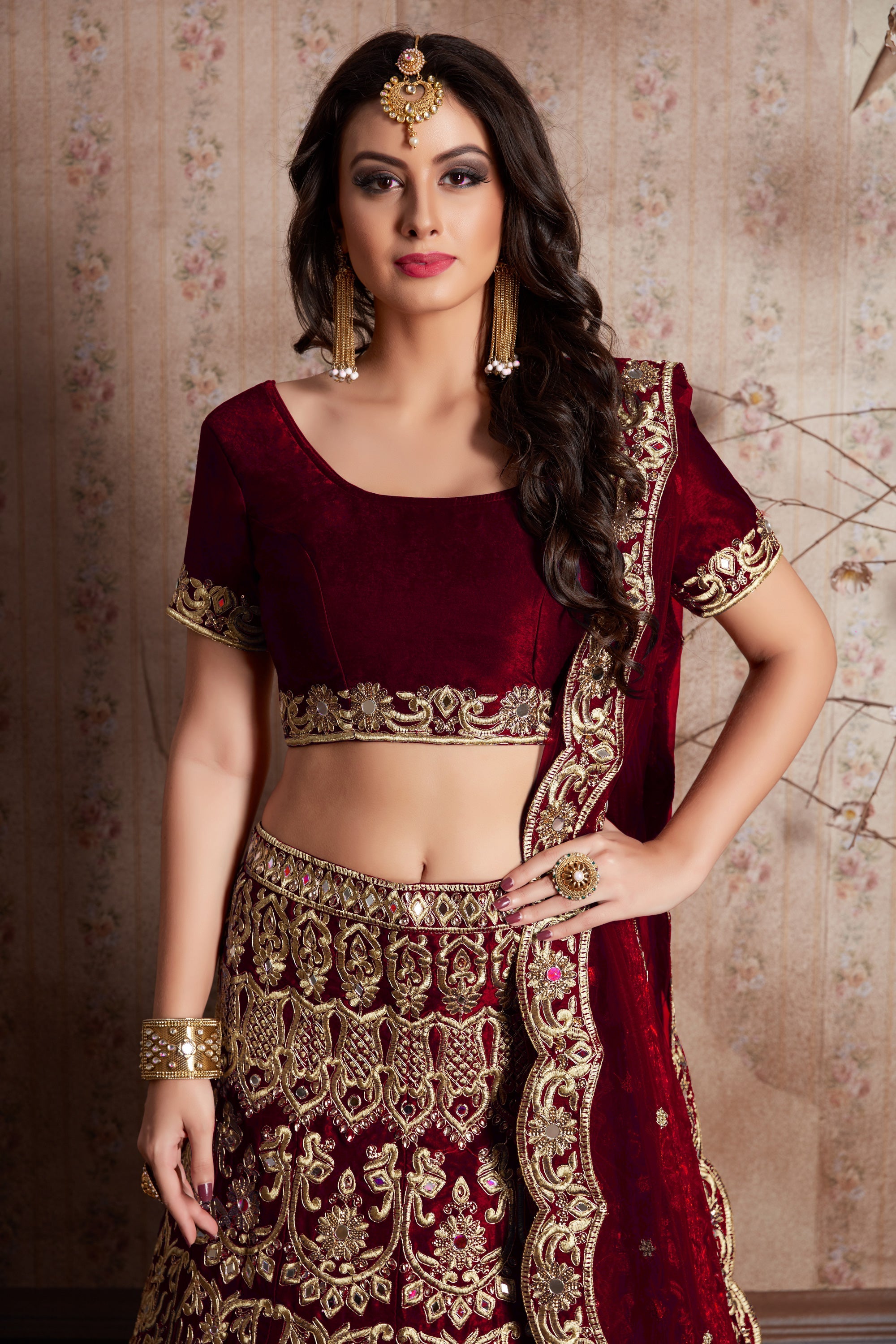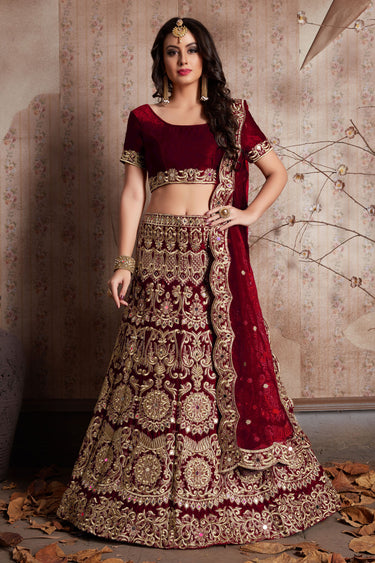 Velvet Embroidered Sangeet Wear Designer Lehenga Choli In Maroon Color