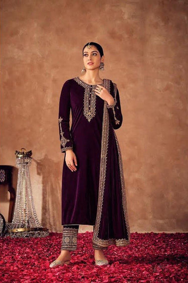 Velvet Fabric Enthralling Purple Color Embroidered Salwar Suit