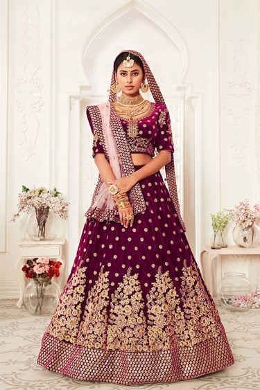 Velvet Fabric Purple Color Wedding Wear Embroidered Stylish Lehenga Choli