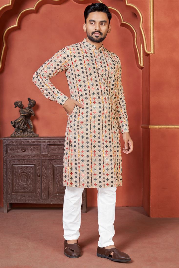Vibrant Cream Color Rayon Printed Kurta Pyjama For Festive