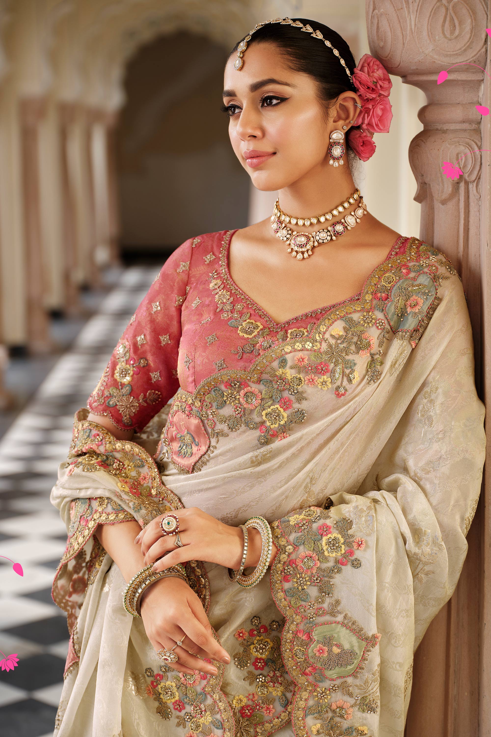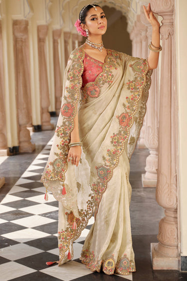 Viscose Jacquard Embroidered Border Work Saree In Beige Color