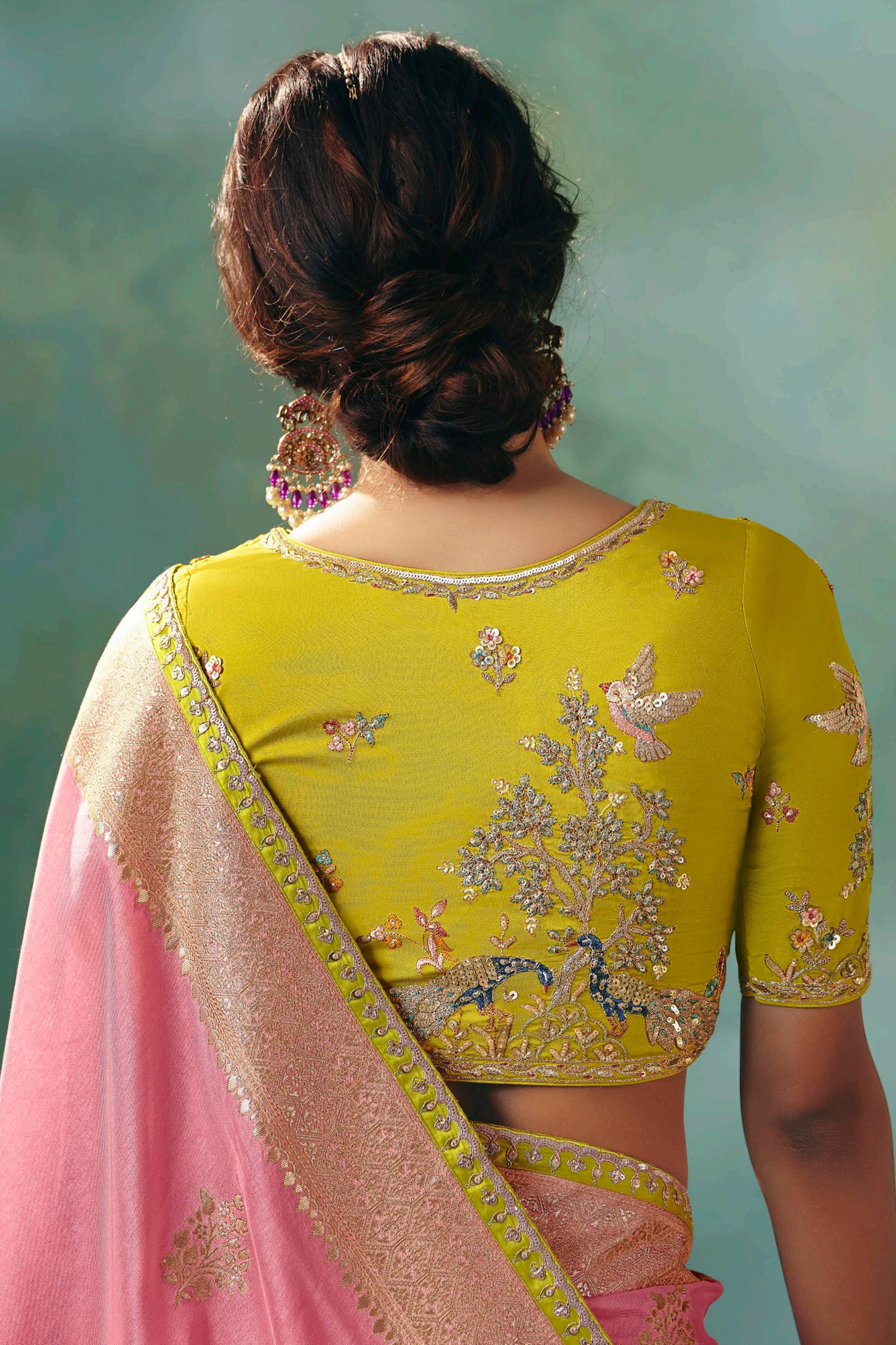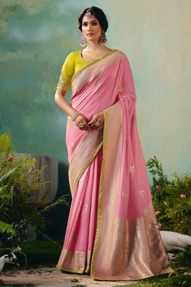 Viscose Silk Pink Zari Border Work Sangeet Wear Saree