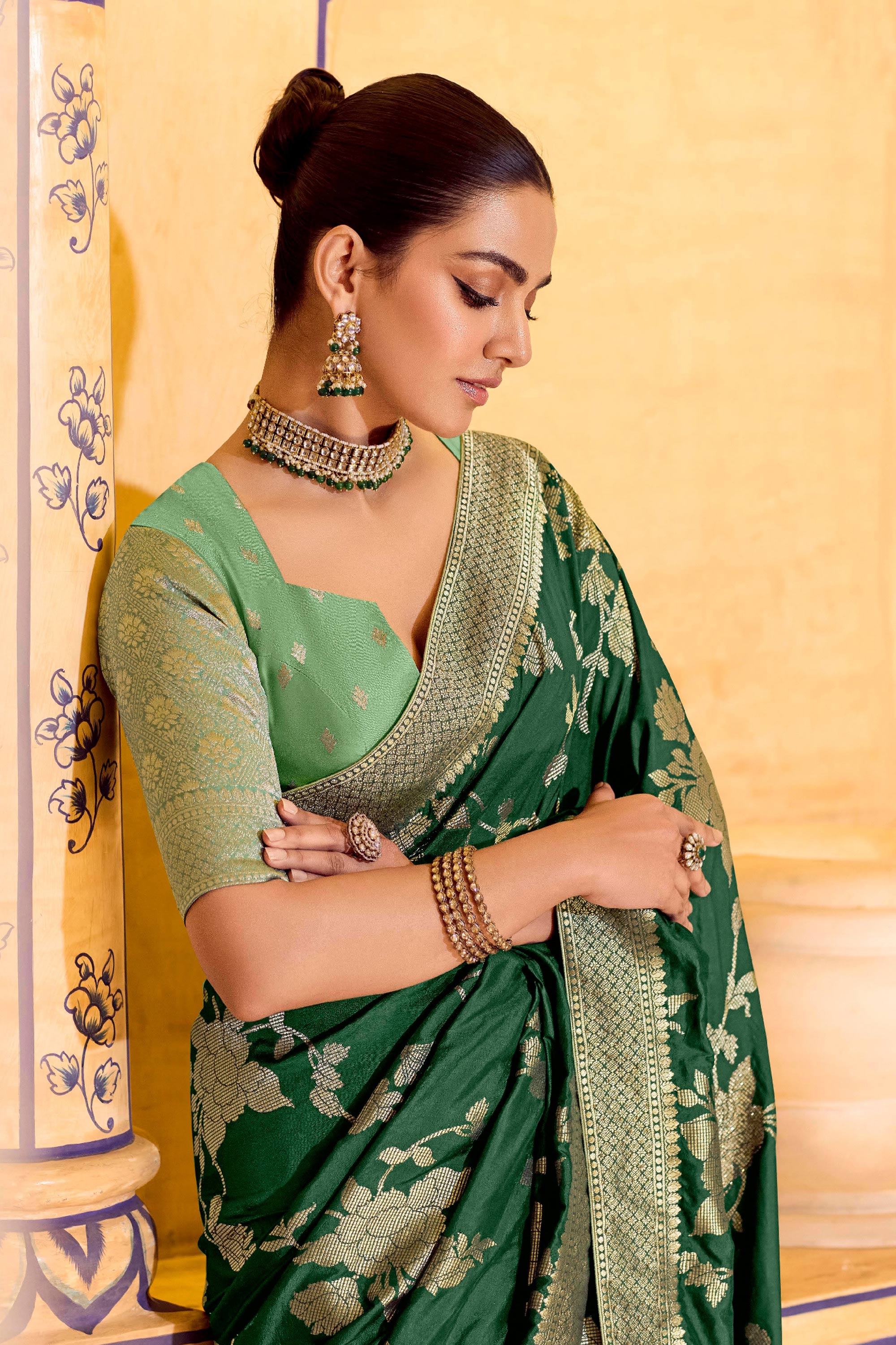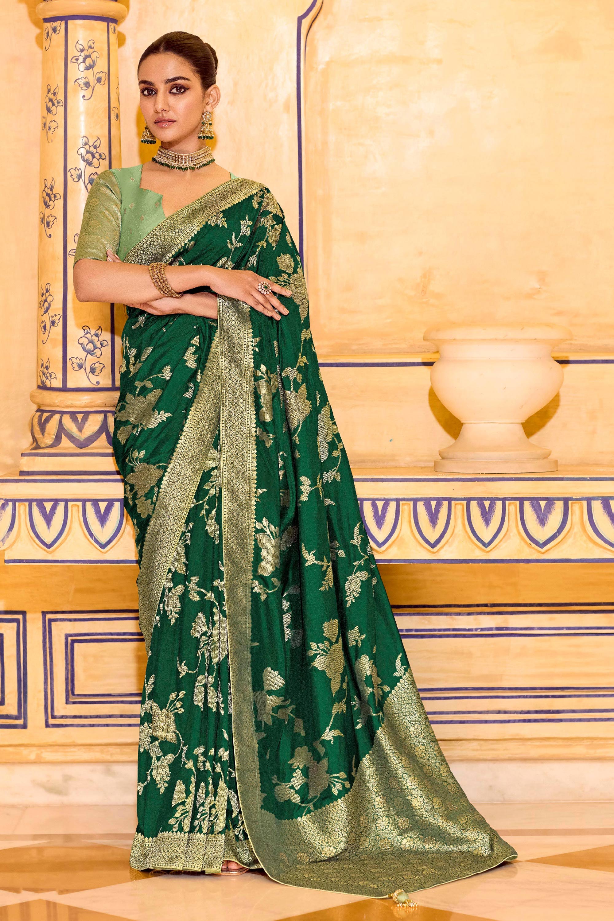 Weaving Work Crepe Silk Dark Green Saree For Wedding Wear