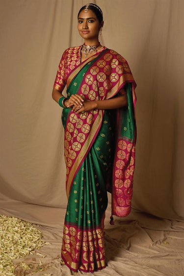 Weaving Work On Brasso Fabric Dark Green Color Gorgeous Saree