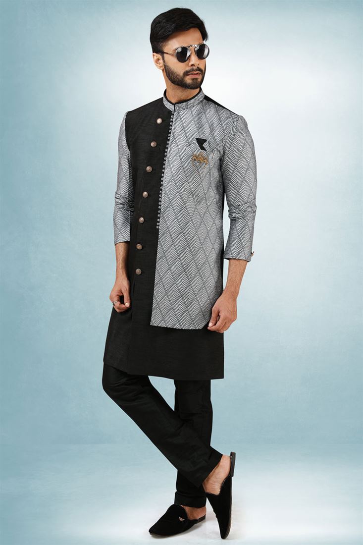 Wedding Wear Art Silk Fabric Black Color Printed Indo Western For Men