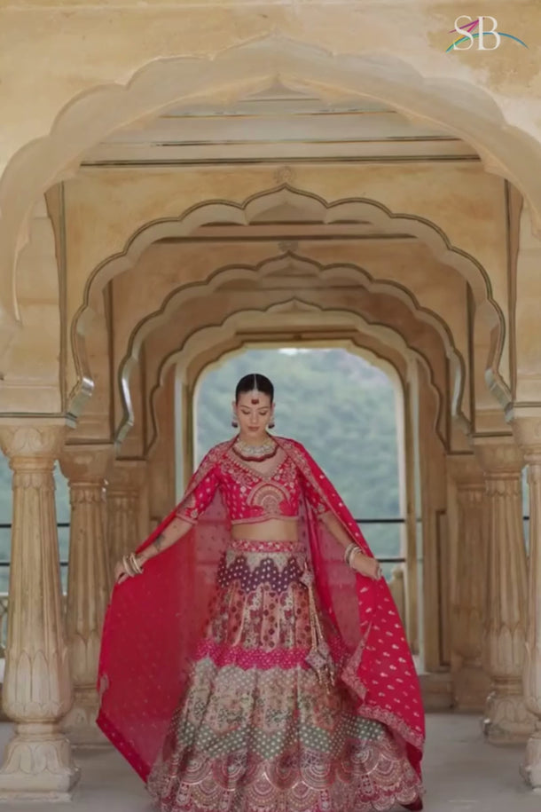 Step into your wedding day with the timeless elegance of our Bridal Banarasi Silk Lehenga. Crafted to exude luxury, this lehenga is made from rich Banarasi silk, known for its exquisite texture and royal charm. The blouse, made from smooth silk, pairs beautifully with the lehenga, enhancing the sophisticated allure. Completing the ensemble, a pure viscose dupatta cascades gracefully, adding an ethereal touch to your bridal look. Intricate embroidery work adorns each piece, creating a captivating, handcrafted finish that catches every eye. Perfect for wedding wear, this lehenga is designed to make you the star of your special day. Please note: colors may vary slightly due to digital imaging, and accessories shown are styled for display only.