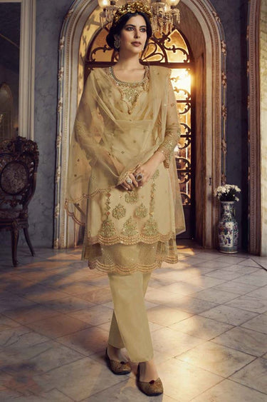 Wedding Wear Georgette Fabric Beige Color Embroidered Work Soothing Salwar Suit