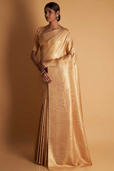 Wedding Wear Two Tone Kanjivaram Silk Fabric Cream Color Zari Weaving Work Saree
