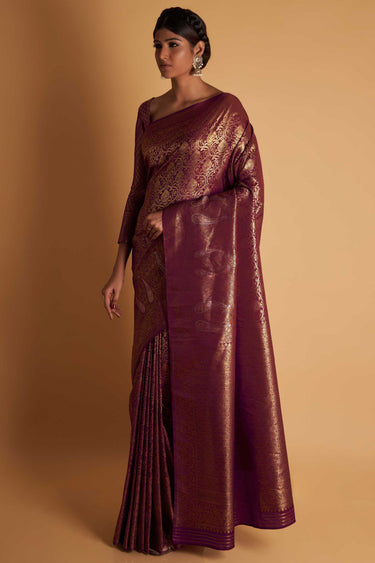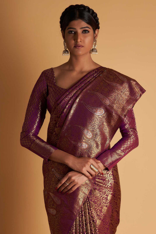 Wedding Wear Two Tone Kanjivaram Silk Fabric Zari Weaving Work Saree In Purple Color