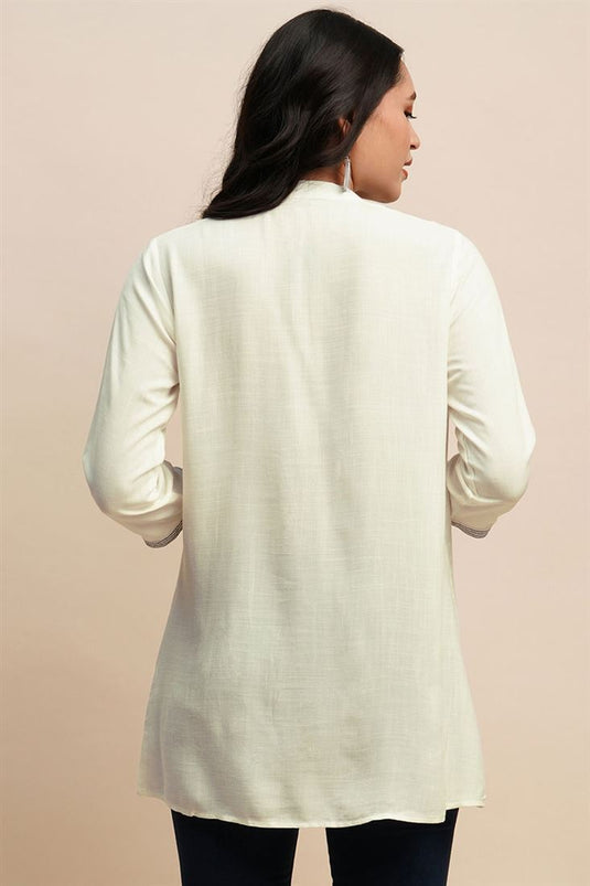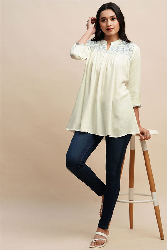 White Color Rayon Fabric Bewitching Embroidered Readymade Short Kurti