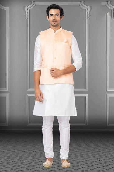 Elevate your traditional wear with the Reception Wear Readymade Reach Color Beautiful Kurta Pyjama For Men. This ensemble comes with a stylish 3 pcs jacket set, perfect for festive occasions or wedding receptions. Crafted from high-quality Dhupion Raw Silk, the kurta pyjama offers a comfortable and elegant fit, ensuring you look dapper. The vibrant Reach Color adds a touch of sophistication and grandeur to your wardrobe. Pair it with classic juttis for a complete ethnic look. Embrace tradition with a contemporary twist!