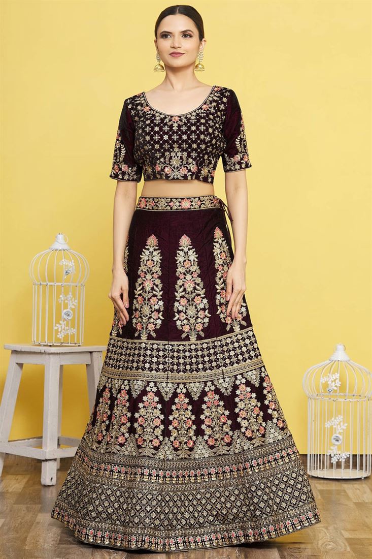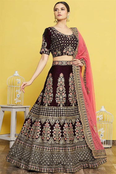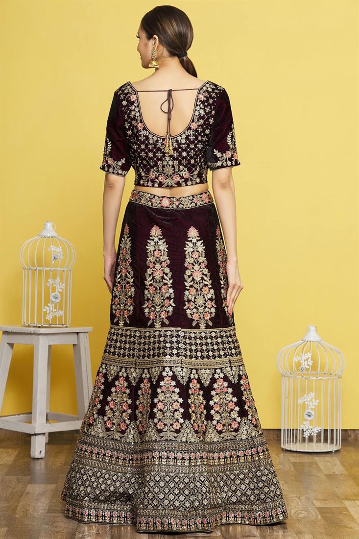 Wine Color Velvet Fabric Incredible Embroidered Bridal Lehenga