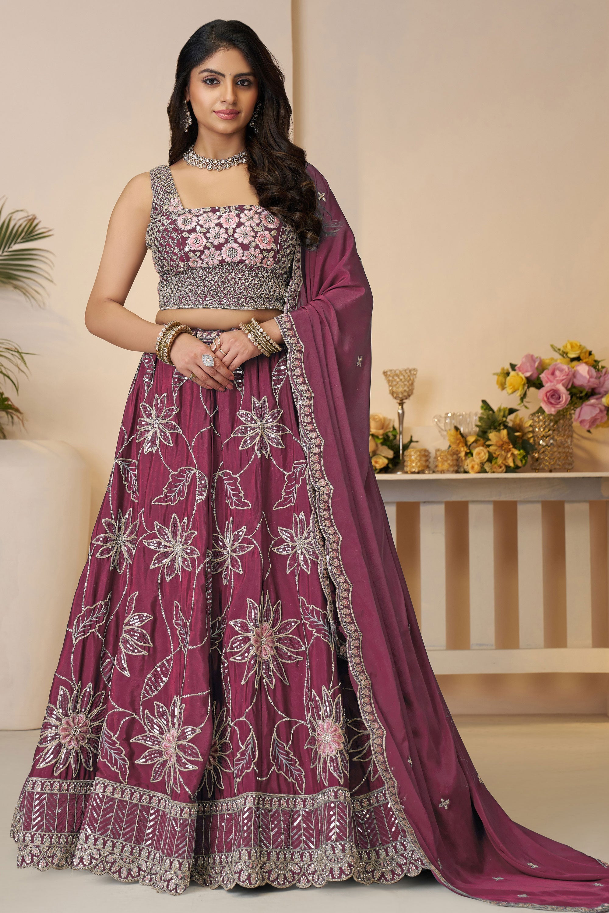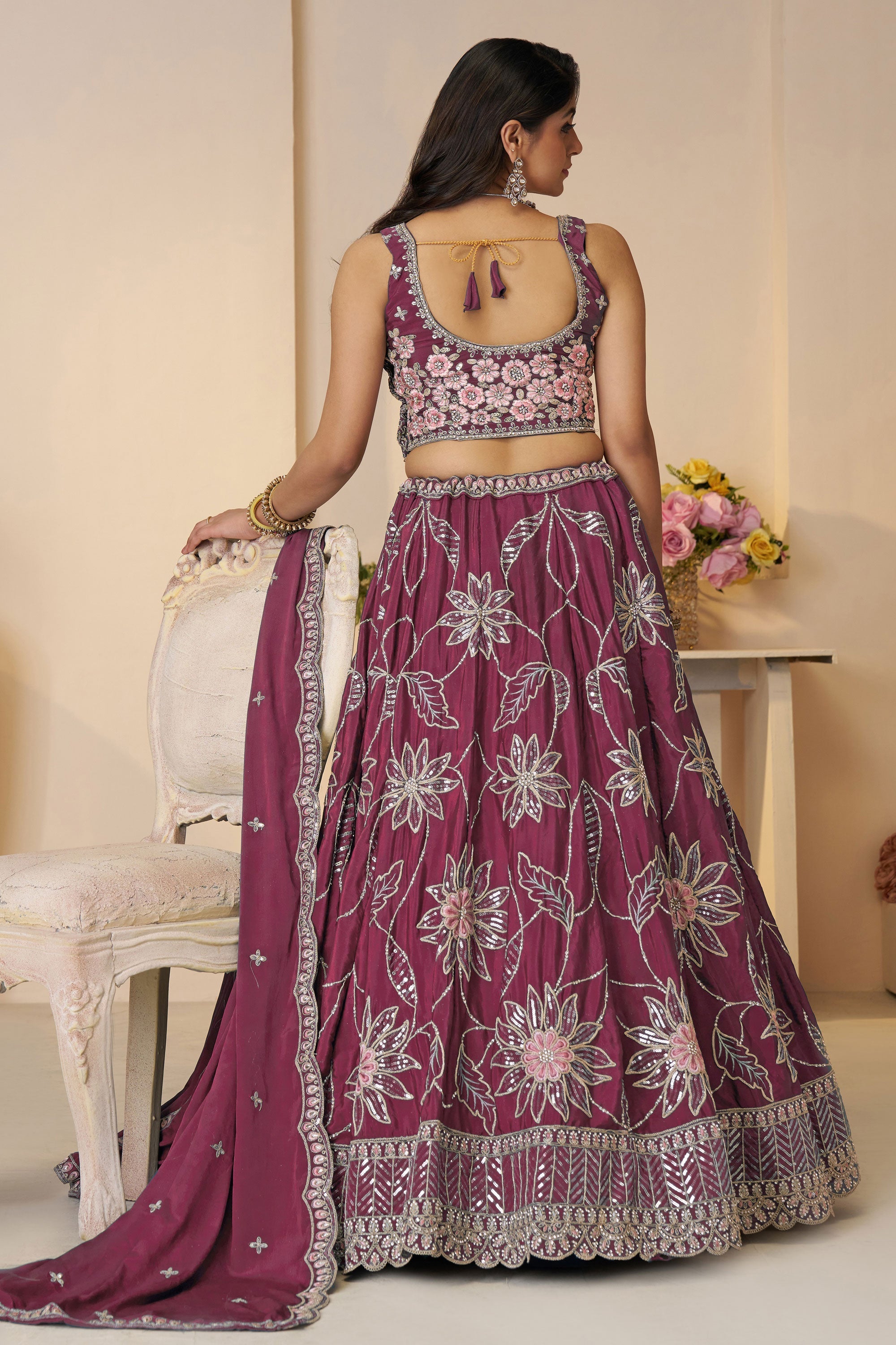 Wine Designer Sequins Work Satin Silk Fabric Lehenga Choli
