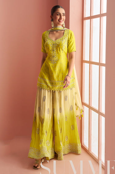 Yellow Chinon Silk Designer Readymade Palazzo Salwar Kameez