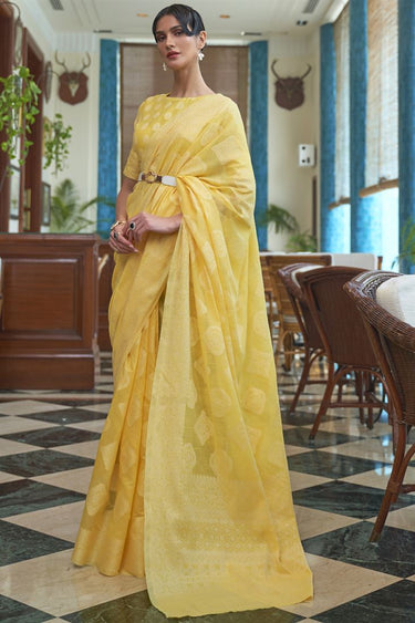Yellow Color Charming Cotton Fabric Party Wear Saree With Fancy Work