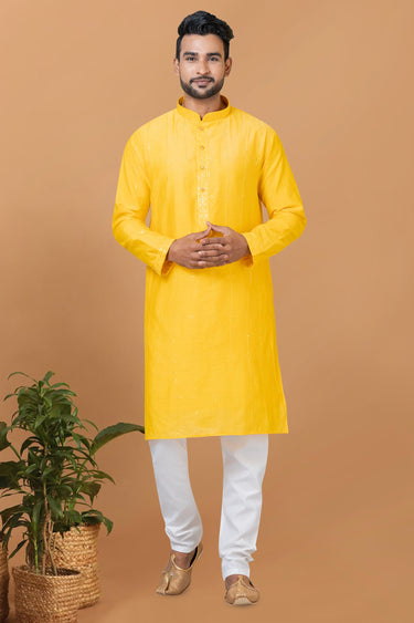 Yellow Color Engaging Cotton Fabric Readymade Kurta Pyjama For Men