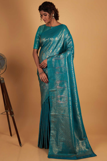 Zari Weaving Work Cyan Color Two Tone Kanjivaram Silk Fabric Reception Wear Saree